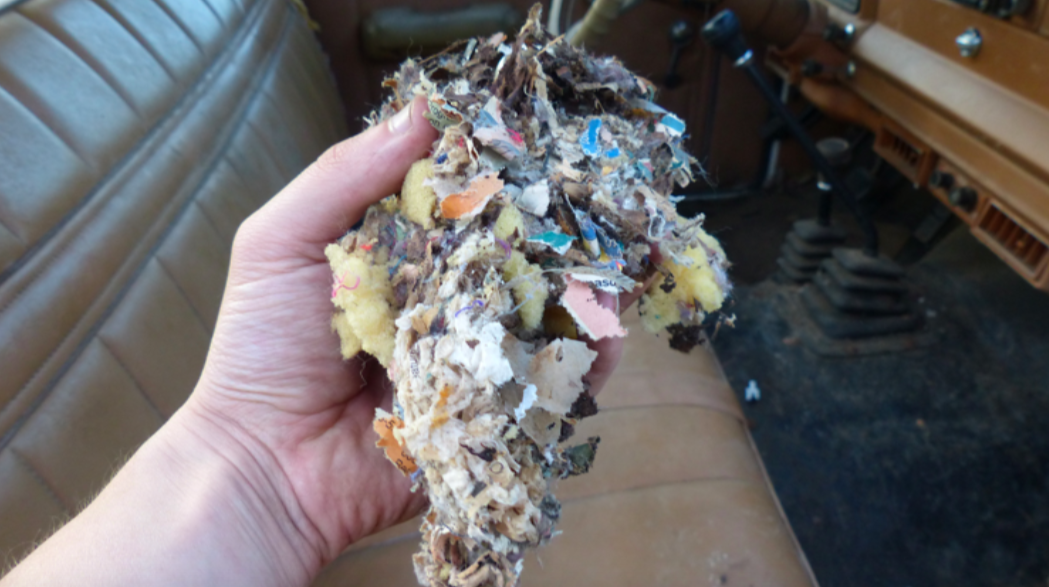 My landlord came over and helped me clean this truck's interior with a bucket of degreaser, which is good, because the farmer who took care of this truck back in North Carolina didn't do a great job at keeping it fresh (see above). The vinyl covering the floor had trapped moisture and grime, and the whole cab emanated the delicious aroma that is rodent droppings.