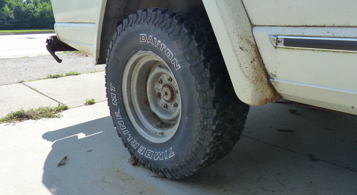 The front tires on the truck look brand new, and they're dated 2013, so they've got a couple of years left in them, I think. Out back, though, the tires have deep treads, but they're too old and too cracked. Luckily, I snagged some nice used, brand-name tires (dated 2017, in excellent shape) 31-inch all-terrain tires from the junkyard: