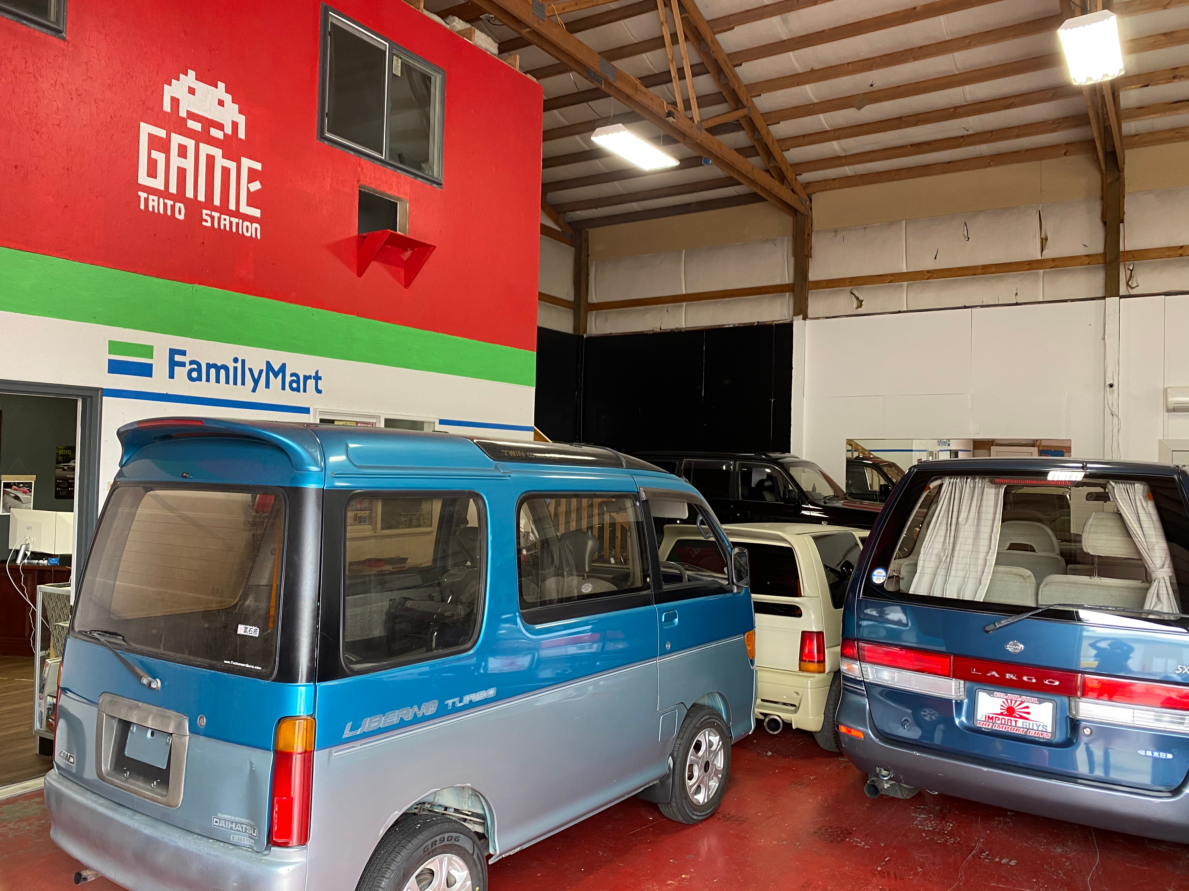 In one corner is an off-road camper while in the other is a minty Nissan Skyline.