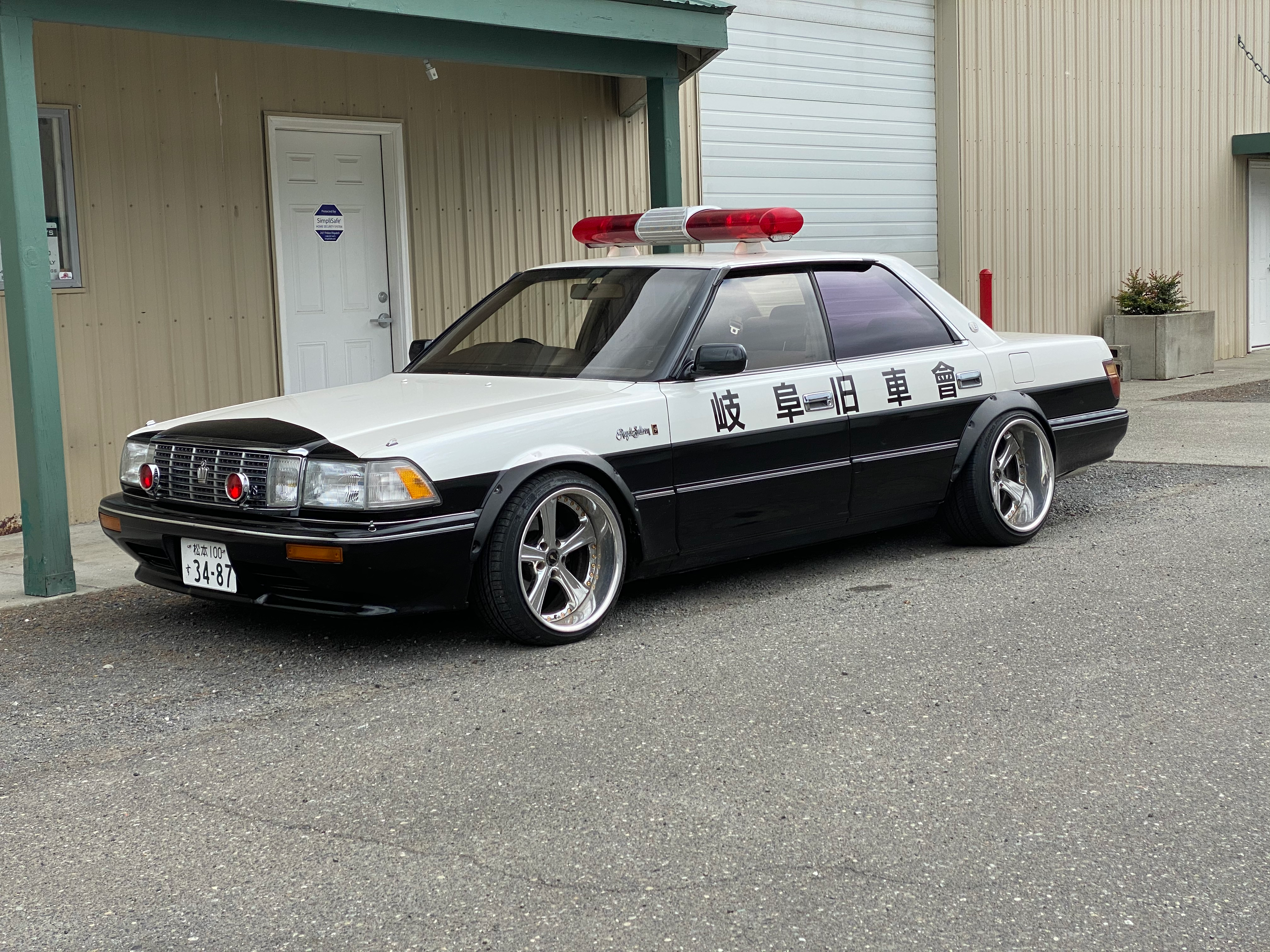 When I arrived, Dylan, the owner of the Import Guys, greeted me by rolling up in this glorious Toyota Crown Royal decked out as a police car and slammed on air bags.