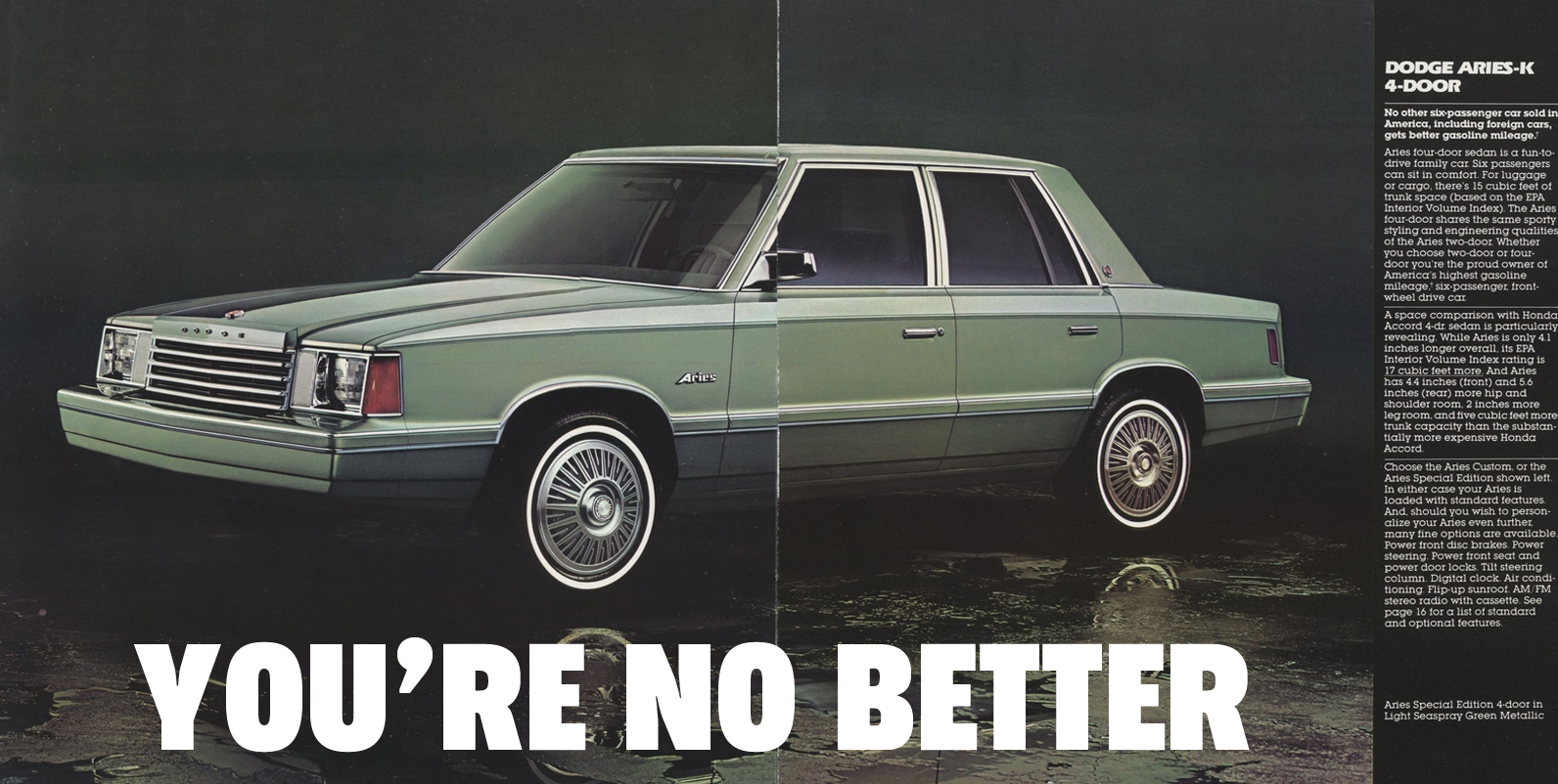 My good friend had one of those 1981 K-Cars as his high school car, and sitting in the back of that sweltering shitbox was awful, too. In Chrysler's case, we can be a little more forgiving, since that was the first year of the K-Car, and they managed to engineer opening rear windows for the next year.