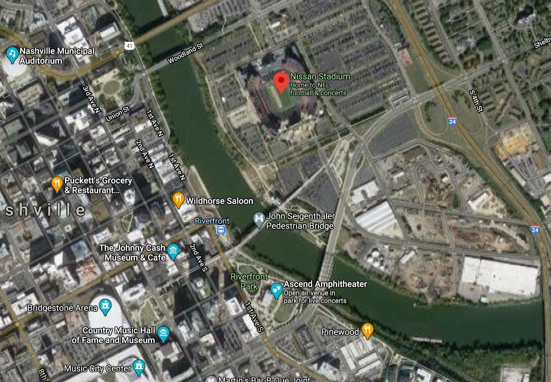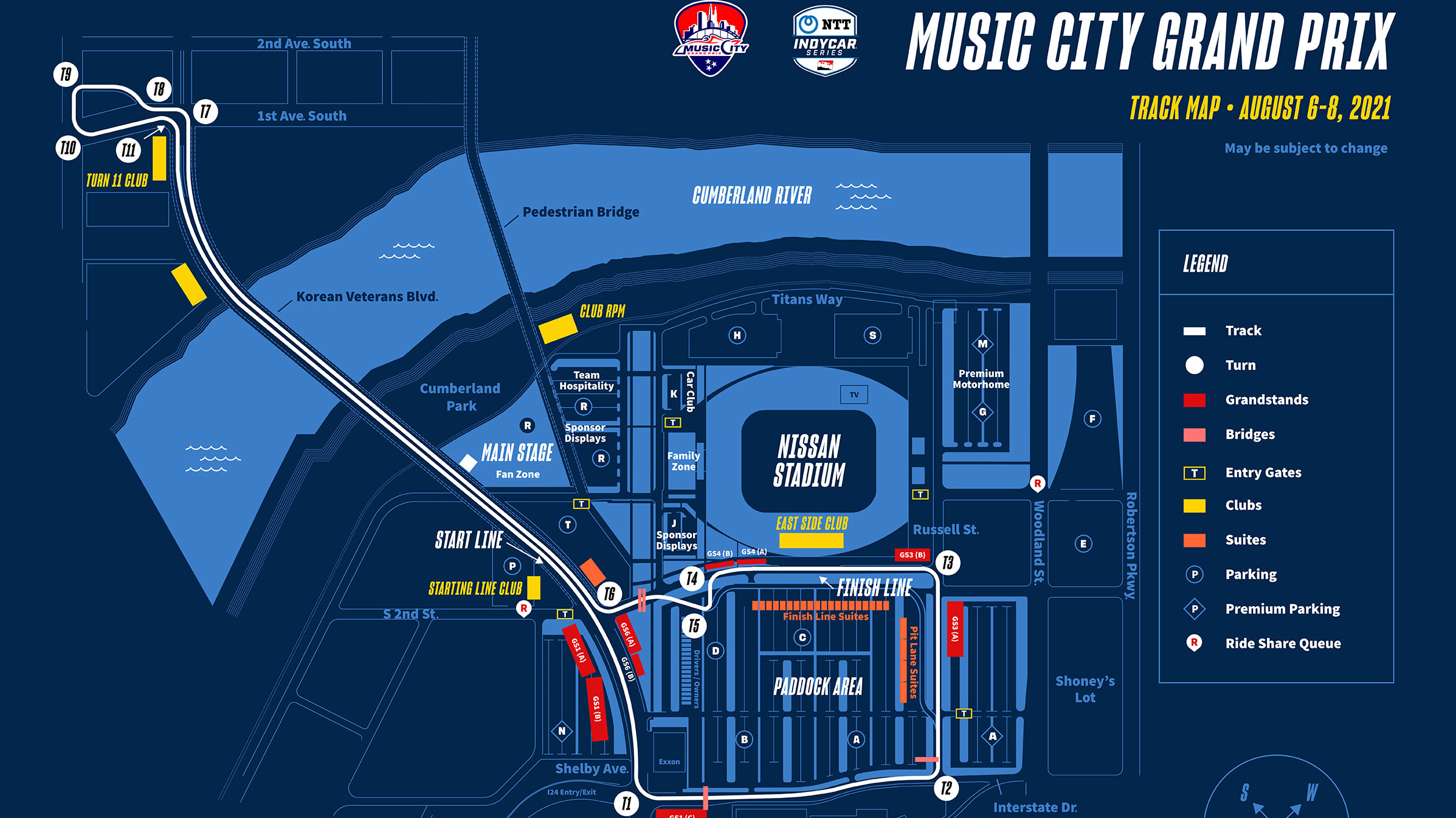 The southern loop of the track will be run around the outside of the Tennessee Titans stadium parking lot before turning to cross the massive bridge across the Cumberland River, navigating a short and tight circuit on the north side of the bridge, then coming back across that bridge for a long curving start-finish "straight" that isn't straight.