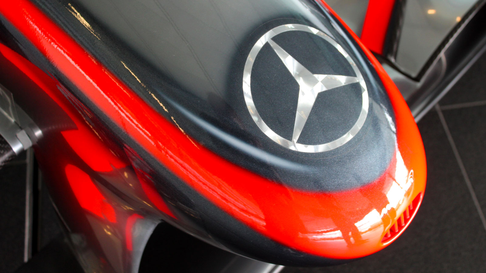This is the very front of the nose cone on Lewis Hamilton's 2009 McLaren F1 car. I love the look of this era of McLaren racers, so was fascinated to see how they appear up close. The chrome finish looked great, and this sparkling Mercedes Logo up front really caught my eye – I think I might be part magpie.