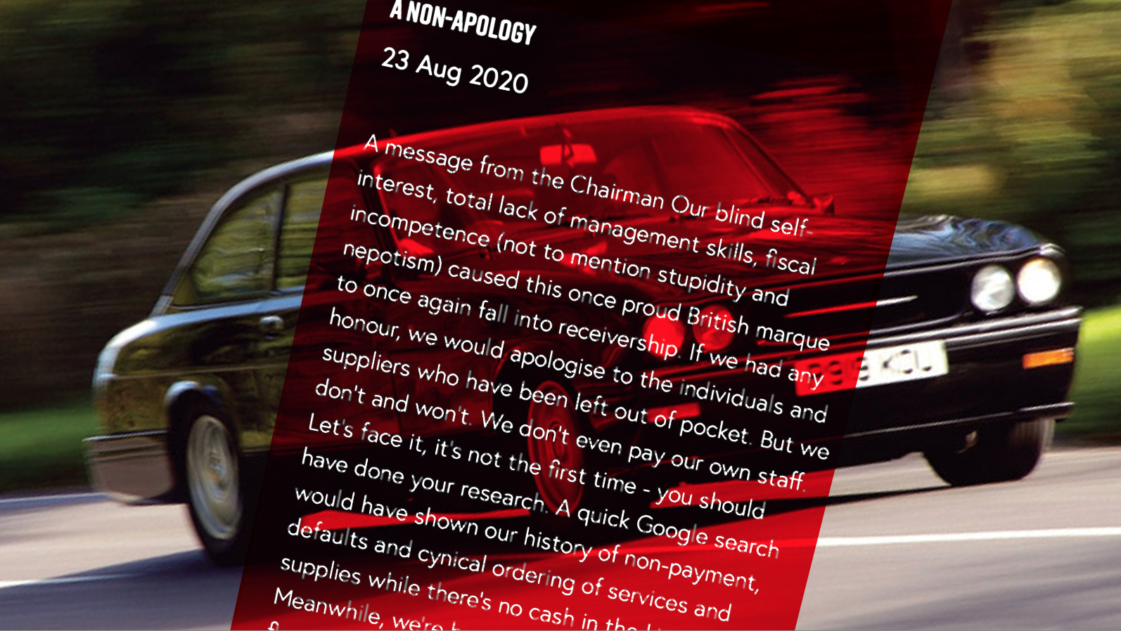 Our blind self-interest, total lack of management skills, fiscal incompetence (not to mention stupidity and nepotism) caused this once-proud British marque to once again fall into receivership. If we had any honour, we would apologise to the individuals and suppliers who have been left out of pocket. But we don't and won't. We don't even pay our own staff.