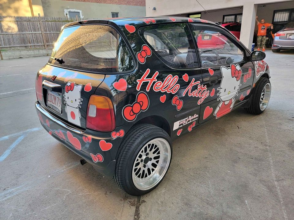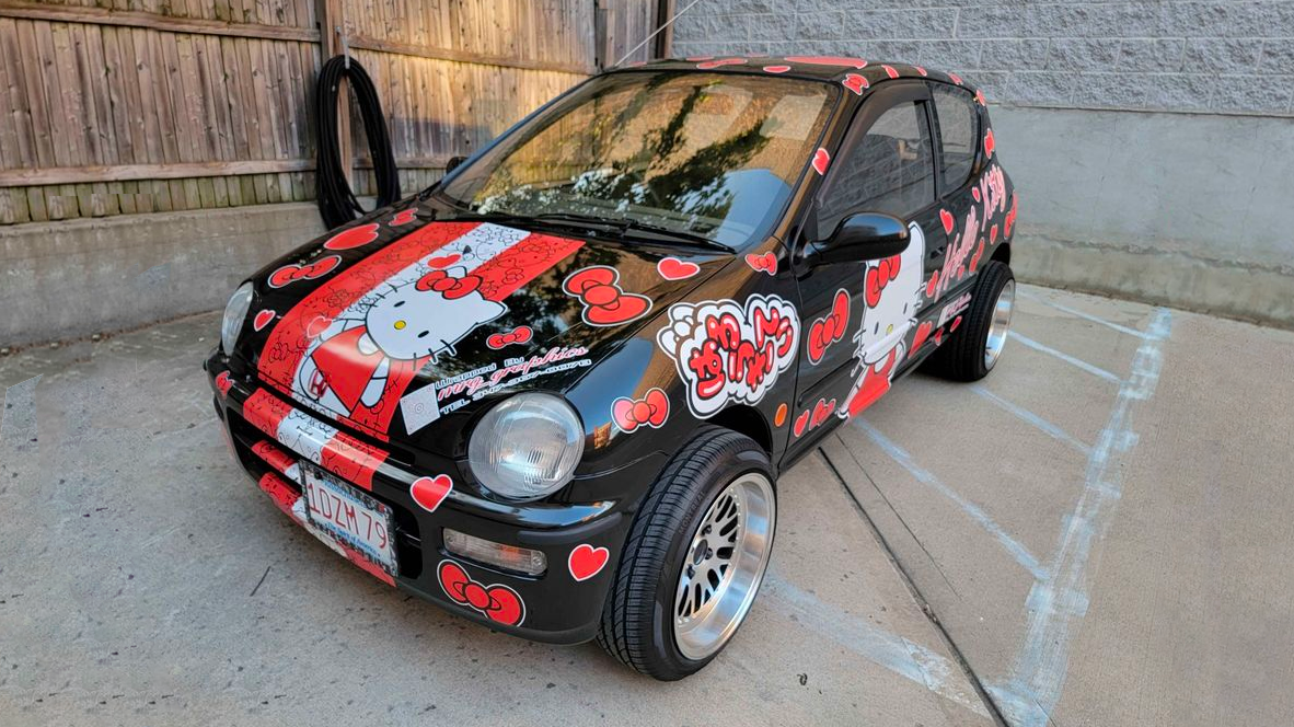 This is a JDM Honda Today, a tiny little right-hand-drive hatchback, and it is coated tip to tail in Hello Kitty graphics. I love it. I tried to convince Rory to let me expense it as a staff car, but I was turned down. My loss is your gain — now you can own the perfect car.