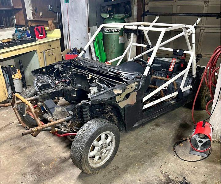 At least one owner — seemingly the current one — was also a speed enthusiast, judging by the car's list of mods. The interior is stripped out behind the front seats, replaced with a bolt-in cage and a pair of harnesses that absolutely would not pass tech at your local track day. Install a harness bar, then we'll talk.