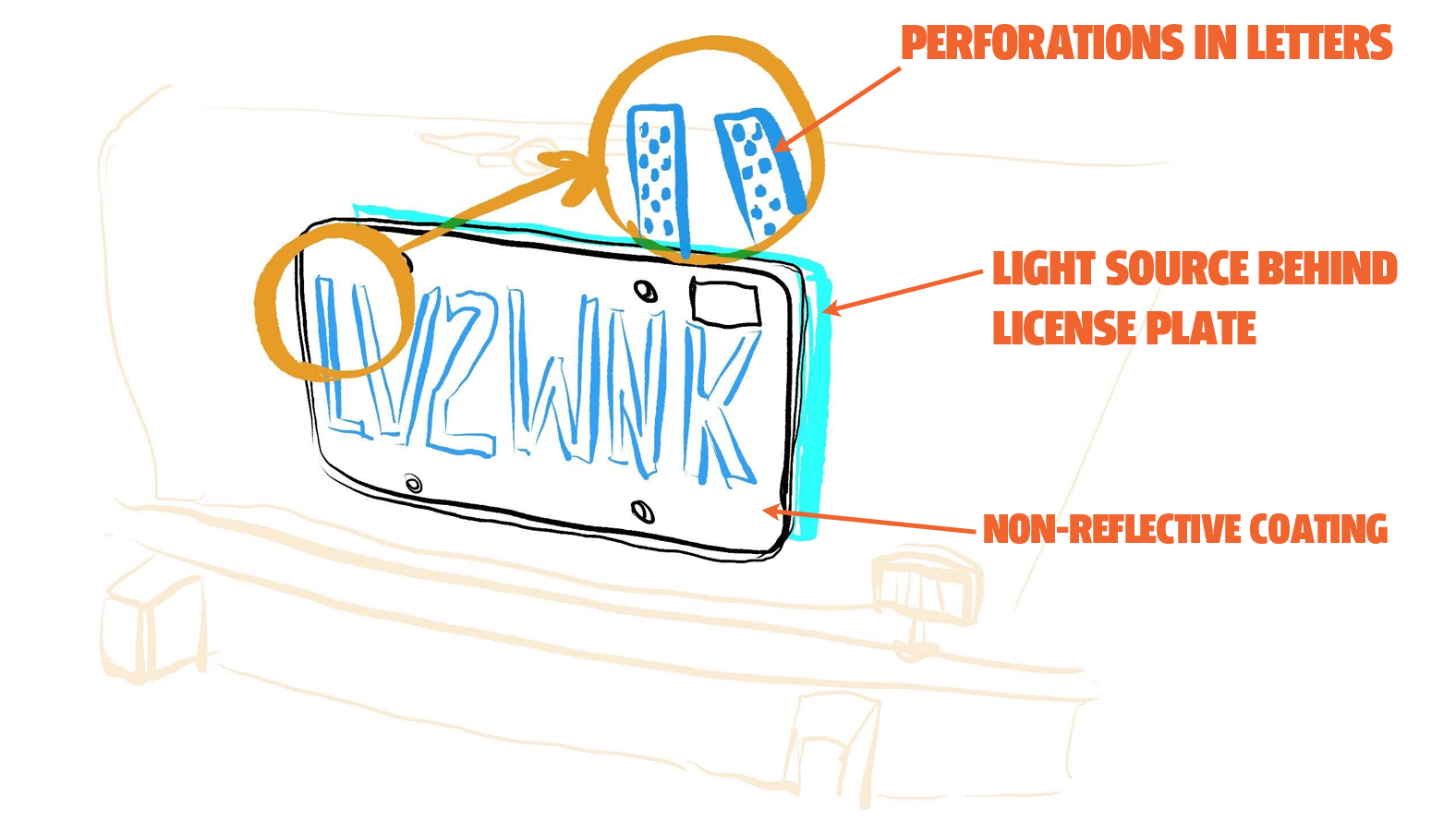 Here's how I think it can work. License plates are still made the same way, from the same stuff—stamped sheet metal. The difference is that the letters and numbers, instead of just being embossed stampings, are now perforated stampings, still embossed letters, but the inside of those letters are punctured with many, many little holes, like a colander or something.