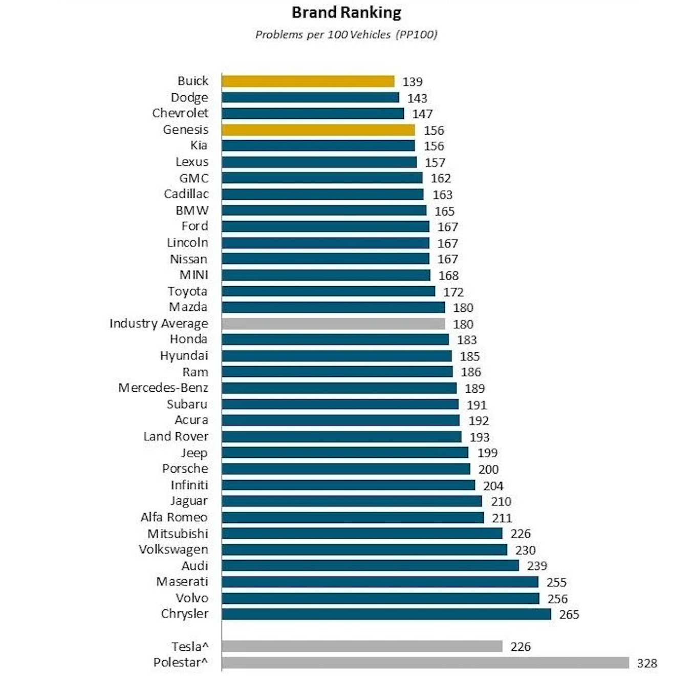 Buick leapt from 12th place last year to first place in 2022, taking the top spot overall. And Genesis ranked highest among premium brands. The usual quality suspects like Toyota and Honda couldn't even crack the top five. Toyota had 172 PP100, and Honda had 183 PP100, which is below the industry average of 180.