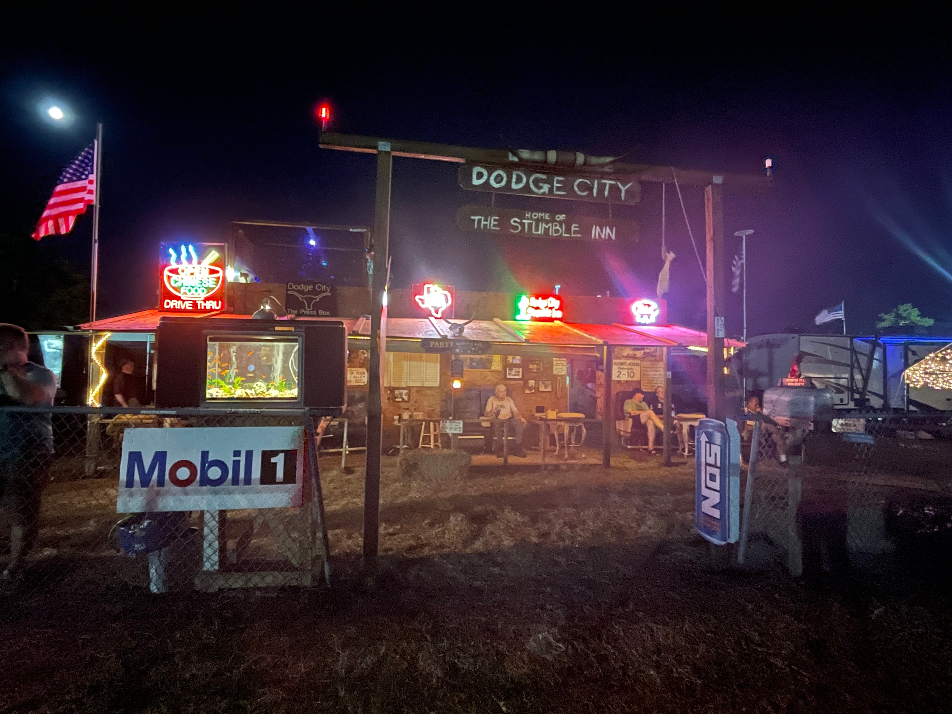 The campsites that stand out the most, often have the most elaborate setups. This year, a campsite created their very own saloon, "Dodge City." There was seating around the old western facade, a TV with the race broadcasting, a working fish tank, AND, a caged rooster. A few sites had their own bars they had built, and one site had a nightclub-level of liquors arranged for your enjoyment.
