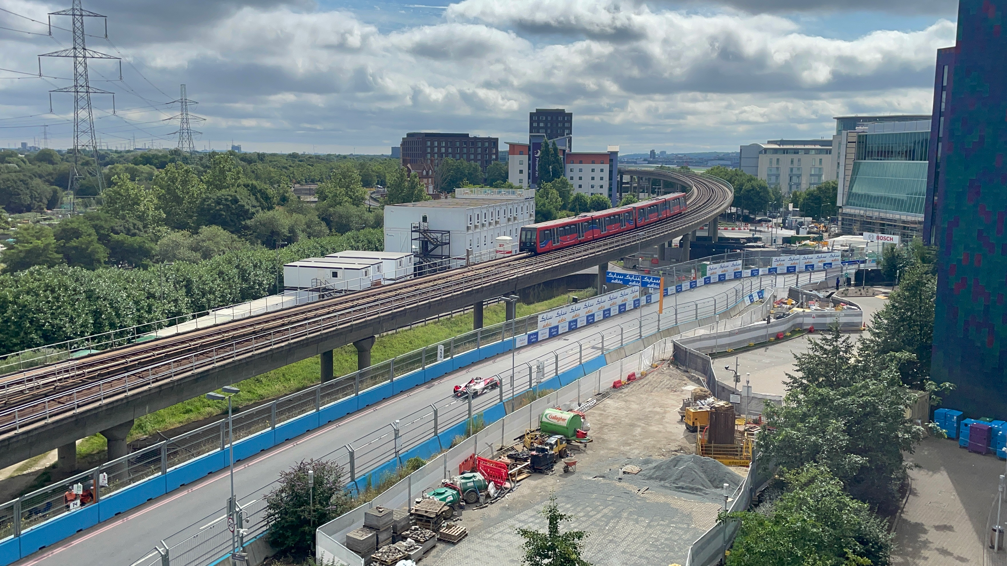 Thankfully, the grimy side of Formula E still has its moments, like this stretch of track around the back of the London circuit where 200mph electric racers can go head-to-head with 60mph commuter trains.