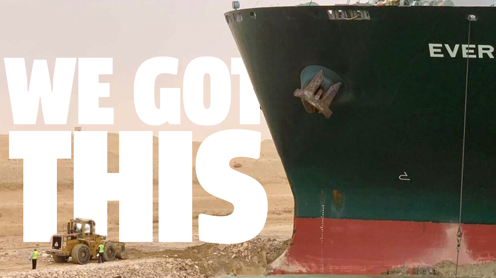 The cargo ship Ever Given has been blocking the Suez Canal for a few days now, blocking a crucial trade route and causing the rerouting of a bunch of other container ships carrying the landfill-bound junk that keeps the non-financial scam part of the modern economy going. We're fine with it staying stuck, it's generating decent traffic.