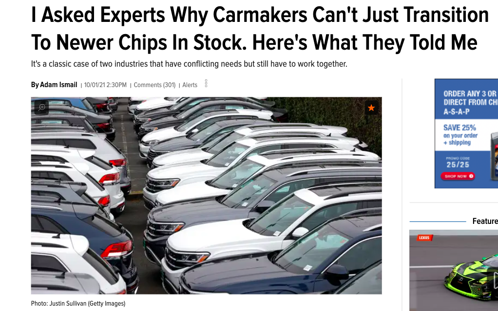 That's what makes Adam Ismail's story, titled "I Asked Experts Why Carmakers Can't Just Transition To Newer Chips In Stock. Here's What They Told Me" so compelling. Adam asked a question that readers didn't know they wanted an answer for, namely: Why can you buy state-of-the-art electronics without much issue while car sales are being held up by a chip limitation? Why aren't electronics having chip shortages of the same magnitude?