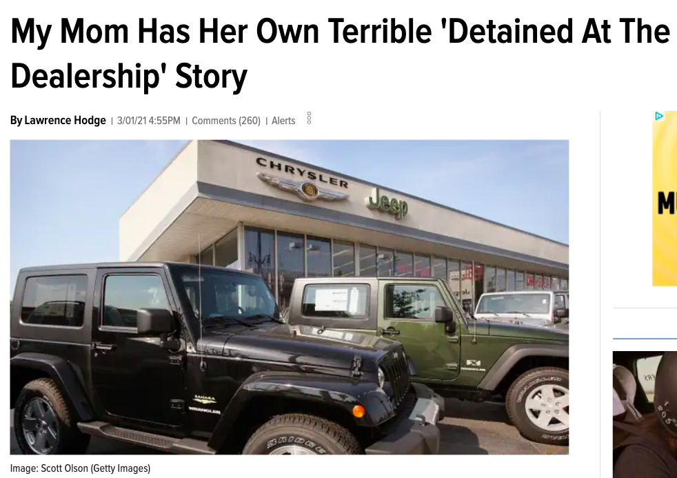 Lawrence Hodge's story about how a California dealership detained his mom over a Chrysler Sebring is so messed up, it'll make your blood boil. The infuriating story works well with Lawrence's relaxed writing style drawing from his childhood memories, resulting in an article so compelling that hundreds of thousands of people couldn't help but read.