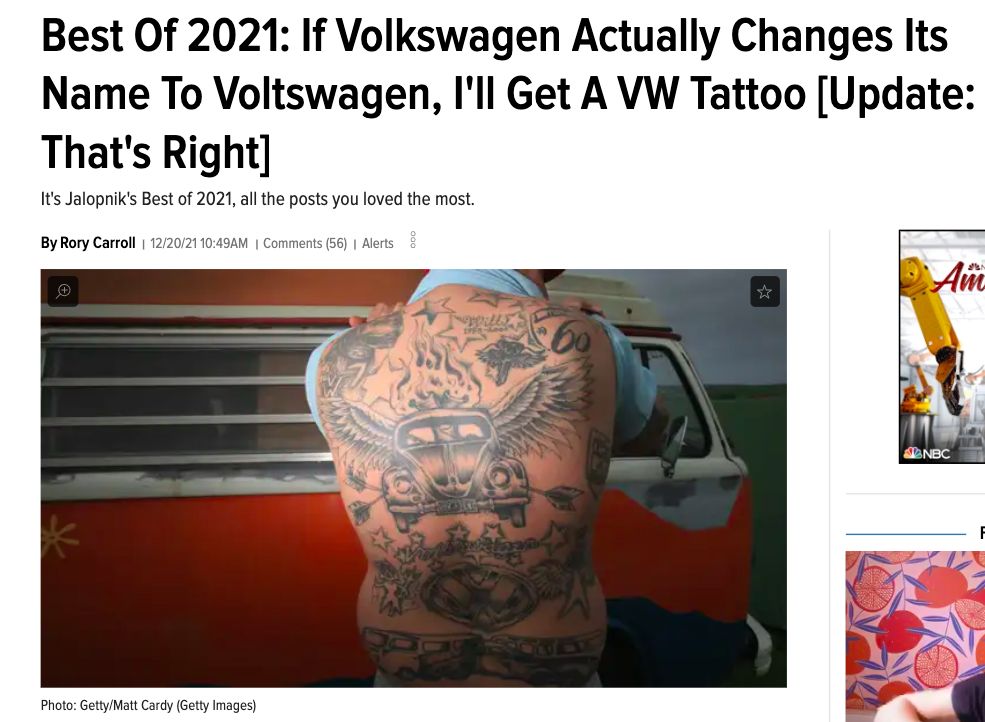 Rory was so confident, in fact, that he wrote an article titled: "If Volkswagen Actually Changes Its Name To Voltswagen, I'll Get A VW Tattoo." And while, in retrospect, this might not seem like a big deal since the whole concept of "Voltswagen" is laughable, you have to realize that pretty much every other outlet had believed the press release (because, again, Volkswagen had confirmed it).