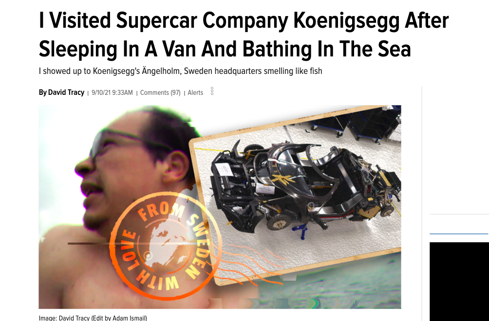 I think the 2021 story that epitomizes my writing style more than any other is "I Visited Supercar Company Koenigsegg After Sleeping In A Van And Bathing In The Sea." It's a bonkers tale of me living in a $600 diesel manual Chrysler Voyager (which I fixed up), bathing in the Baltic Sea, and then chatting with engineers at one of the most prestigious automotive engineering firms on Earth. The story was fun because it allowed me to blend wrenching, traveling, entertaining, understanding complex engineering, and then wrap it all up with what I enjoy most: writing.