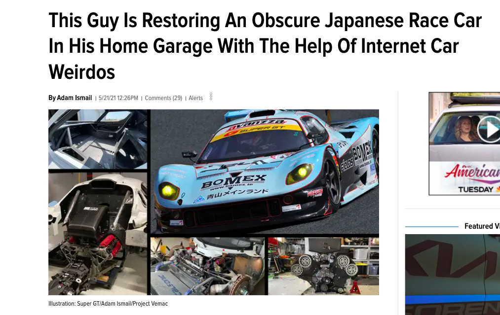 Adam Ismail is a seasoned journalist, having worked as a tech writer prior to Jalopnik. As such, his interviewing and writing skills are second to none. It's this skill, along with a great story about a fascinatingly obscure car that was difficult to obtain and that has been even more difficult to restore, that makes Adam's article "This Guy Is Restoring An Obscure Japanese Race Car In His Home Garage With The Help Of Internet Car Weirdos" so great.