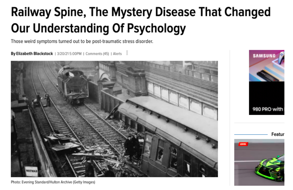 Have you ever heard of "Railway Spine?" I hadn't either. If you read Elizabeth Blackstock's article "Railway Spine, The Mystery Disease That Changed Our Understanding Of Psychology," you'd have learned that it was a name that surgeon Sr. John Eric Erichsen gave in the 1860s to people experiencing physical symptoms after being involved in — and even just witnessing — a train crash. Even when there were no apparent physical injuries, physical symptoms like headaches and back pain plagued these people. Blackstock was at the time finishing up a master's thesis (she was getting two master's degrees while writing at Jalopnik — what a badass) that was a bit of a blend between psychology and literature, so this story was part of her studies. I'm glad she shared it.