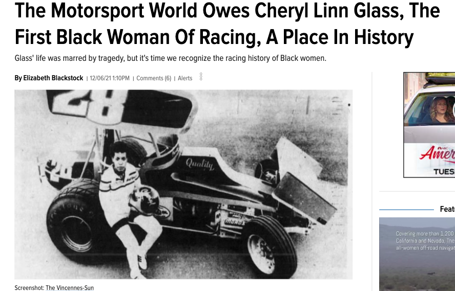 Elizabeth Blackstock's story about Cheryl Linn Glass, the first black woman to race sprint cars professionally in the U.S., highlights a person who deserves to be a household name and a role model. "It is absolutely devastating that the racing world hasn't remembered Cheryl Linn Glass with the reverence deserved of a Black woman who broke down the barriers placed before her to carve out her place as a racer, a scholar, and a businesswoman," Blackstock writes.