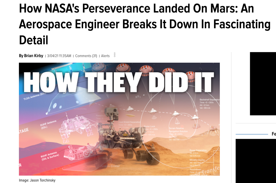 My favorite story to edit was "How NASA's Perseverance Landed On Mars: An Aerospace Engineer Breaks It Down In Fascinating Detail," which my friend Brian Kirby — an engineer who played a significant role in sending a spacecraft into deep space — wrote about NASA's successful Perseverance mission. The way that Kirby wrote this piece makes it clear that he not only intimately understands the chronology of the mission, but he has profound insight to share about the physics behind it. The fact that multiple members of the engineering team working on Perseverance chimed into the comments to offer compliments just goes to show the depth of Kirby's knowledge on this topic and of space travel at large.
