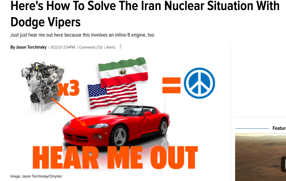 Also, do you realize that Jason wrote an article that proposed hooking three inline-threes together to make a straight-nine, and then installing that into an Iran-built first-gen Viper — all as a way to solve the Iran Nuclear deal impasse? You might think this is just silly, but then the CEO of a think-tank dedicated to Iran diplomacy weighed in: