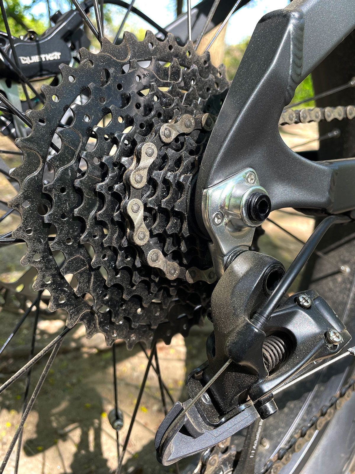 The Jeep e-bike is the American automaker's latest foray into the world of pedal power. At $5,999, the bike I'm testing came with a 1,000-watt mid-drive motor sourced from drivetrain specialists Bafang. The motor is connected to a nine-speed drivetrain that's managed by a Sram XS mechanical derailleur, which quickly shifts the chain over a 11-42 cassette.