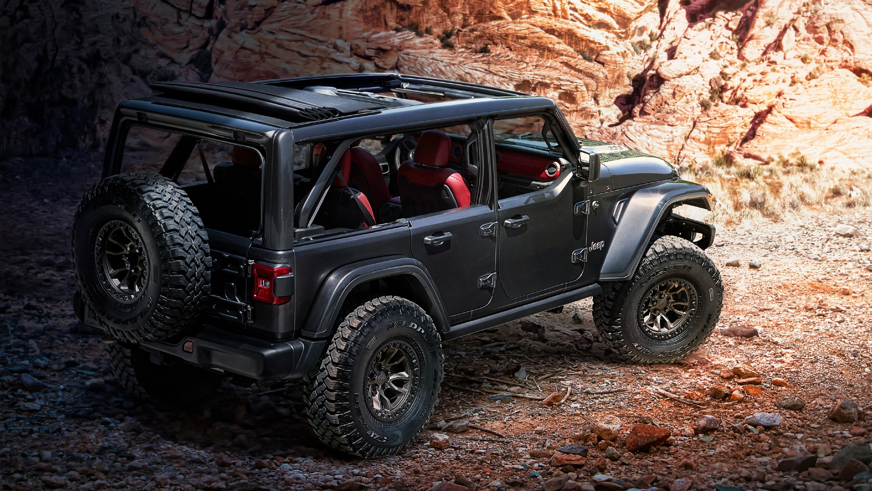 Dana 44 axles, a Selec-Track full-time two-speed transfer case, Tru-Lok electric front- and rear-axle locking differentials and 37-inch mud-terrain tires that wrap around custom 17-inch beadlock wheels