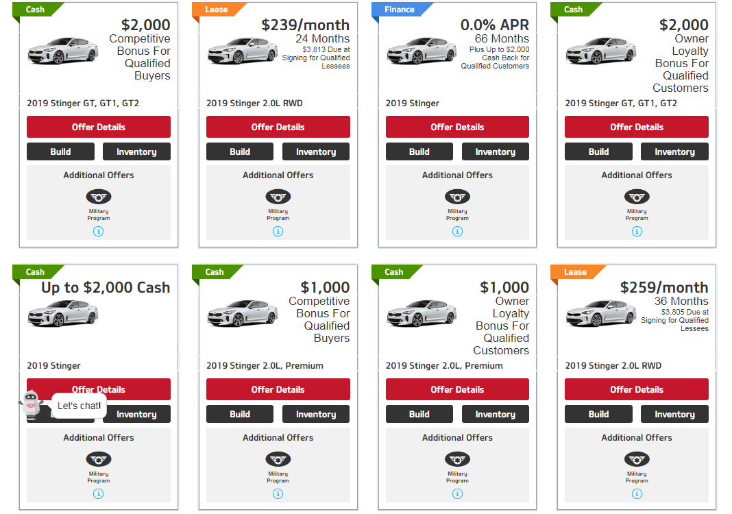 Currently, Kia is offering a slew of incentives and programs for Stingers, though there are different tiers of discounts depending on whether or not you choose the four or six-cylinder model. Good news: the better money is on the faster cars.