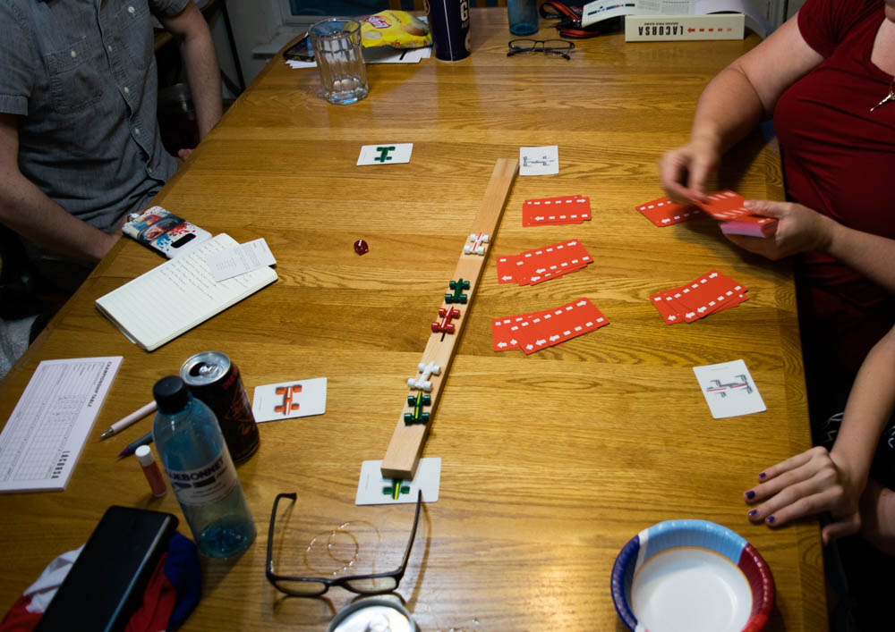 Because you have to use a redline card on top of another card, and because some folks could use three cards in a turn (passing two cards, then extending), some folks would run out of cards sooner than others—but we weren't sure if we were supposed to end the lap, or if we should continue with that driver dropping further back on the grid with each subsequent turn. And at the same time, when a leading driver didn't have any more extend cards, we weren't sure if they should just skip a turn, or if they were supposed to discard a card, or what.