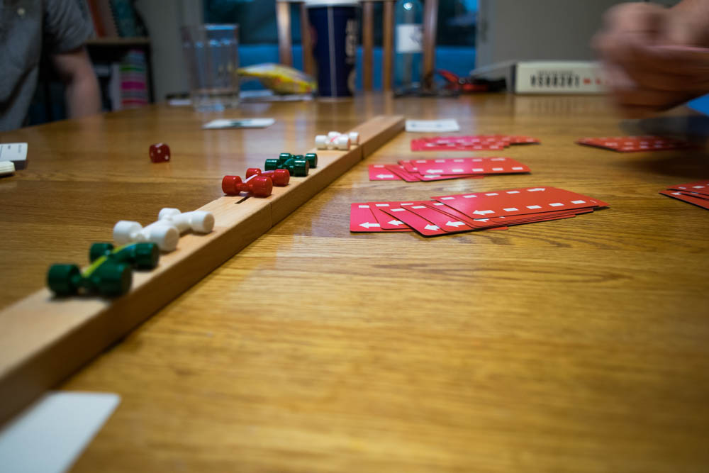 It starts at the back. The last player on the grid challenges the player in front for position, which you do via a War-like strategy. If the player doing the challenging has a higher card, that player passes the player in front. If the player doing the challenging has a lower or equal card to the competition, no one moves. Now we move on to the next round.
