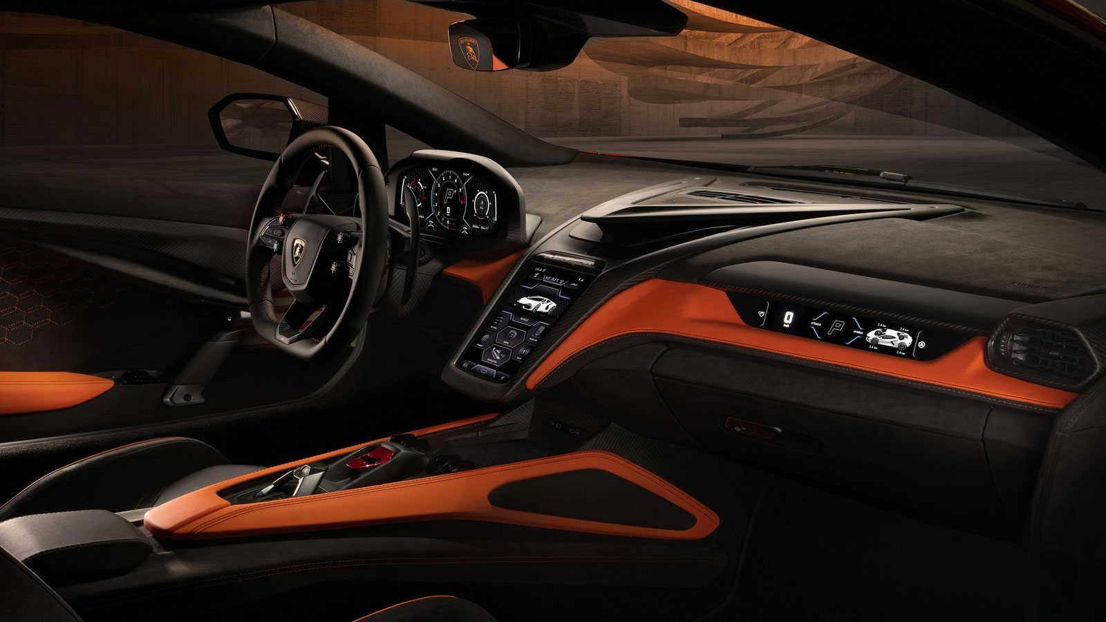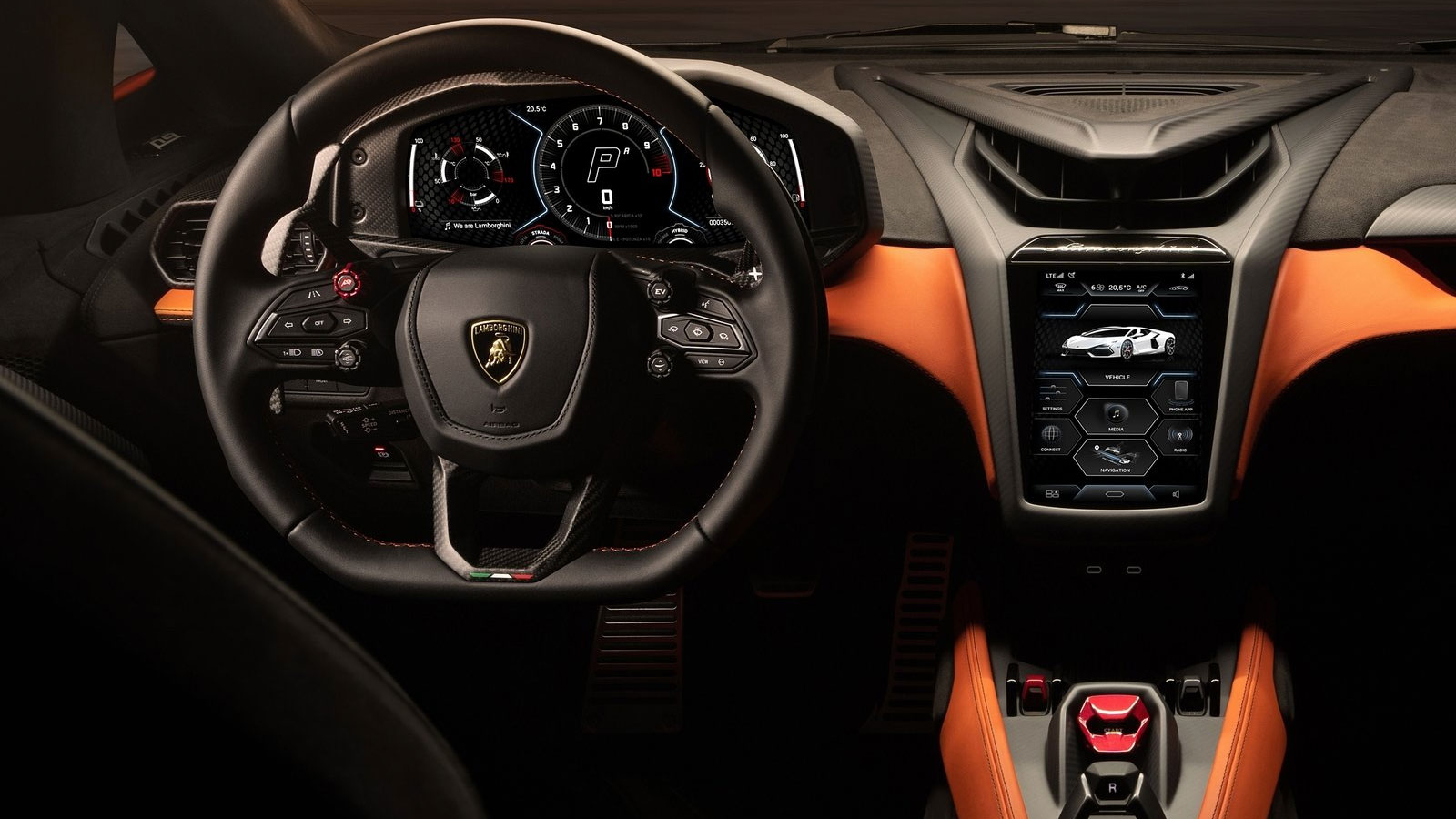 The interior of the Revuelto is suitably Lamborghini, with lots of fighter jet-inspired trimmings and carbon fiber flourishes.
