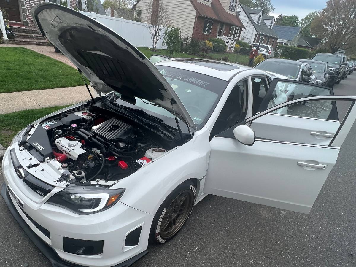 Let me help you out here, prospective buyer. The headlights are aftermarket, and the wheels look like Enkei RPF1s. The radiator hoses have been upgraded, and the engine breathes in through an aftermarket Cobb intake (though the turbo inlet pipe seems factory, so make sure it hasn't worn out). The top-mount intercooler, a weak point for high-boost builts, has been replaced with an all-metal unit. There's an oil catch can, and at least the radiator cap is Mishimoto — possibly the whole radiator. Oh, and there are coilovers. And an aftermarket front wing.