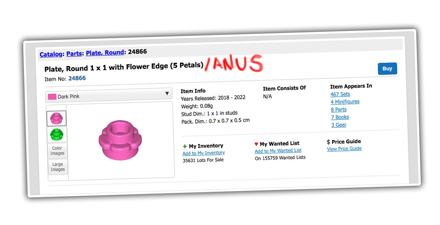 My friends, let me be absolutely clear here: we now live in a world where the Lego corporation has designated a former 1x1 pink flower piece to represent a butthole, a rectum, an anus, and as such the world has changed.