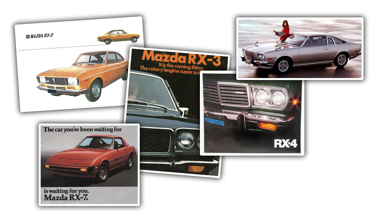 Starting with the Mazda Cosmo, which we can think of as the RX-1, there's been sporty Mazda rotaries called RX-2, RX-3, RX-4, RX-5, RX-7, and RX-8. Piston-engine sports cars Mazda has tended to name "MX" like the MX-6 or the Miata's formal name, the MX-5.
