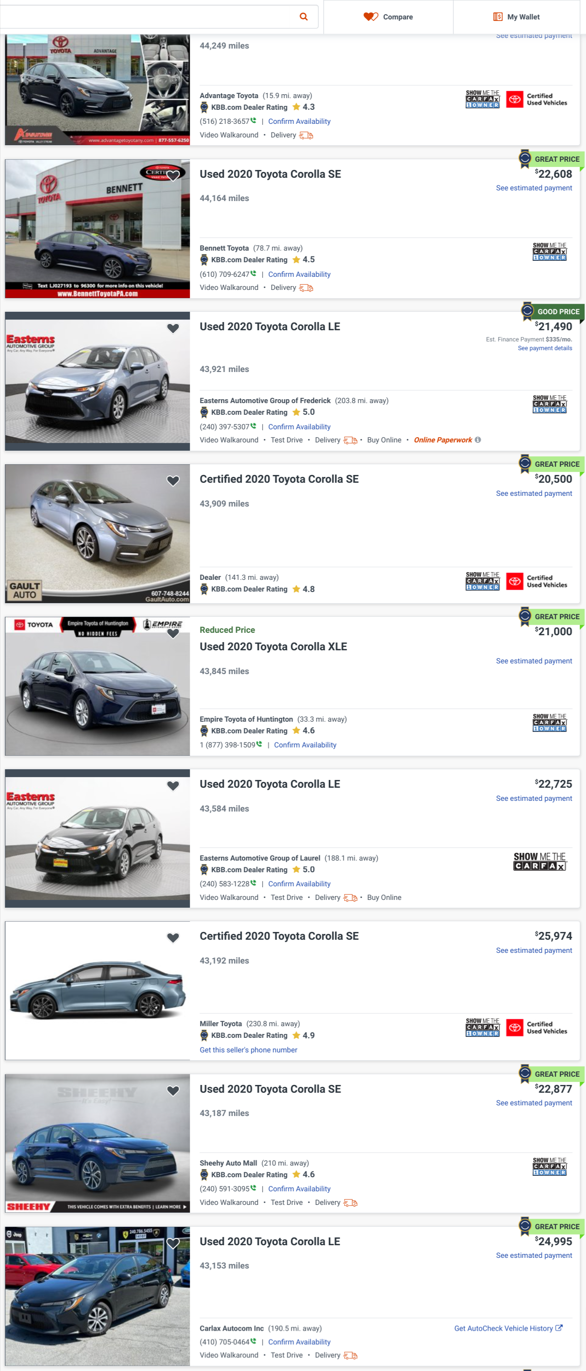 For example, a quick scan of "gently used" Corollas in the NYC market with under 45,000 miles reveals prices in the low to mid $20,000 range.