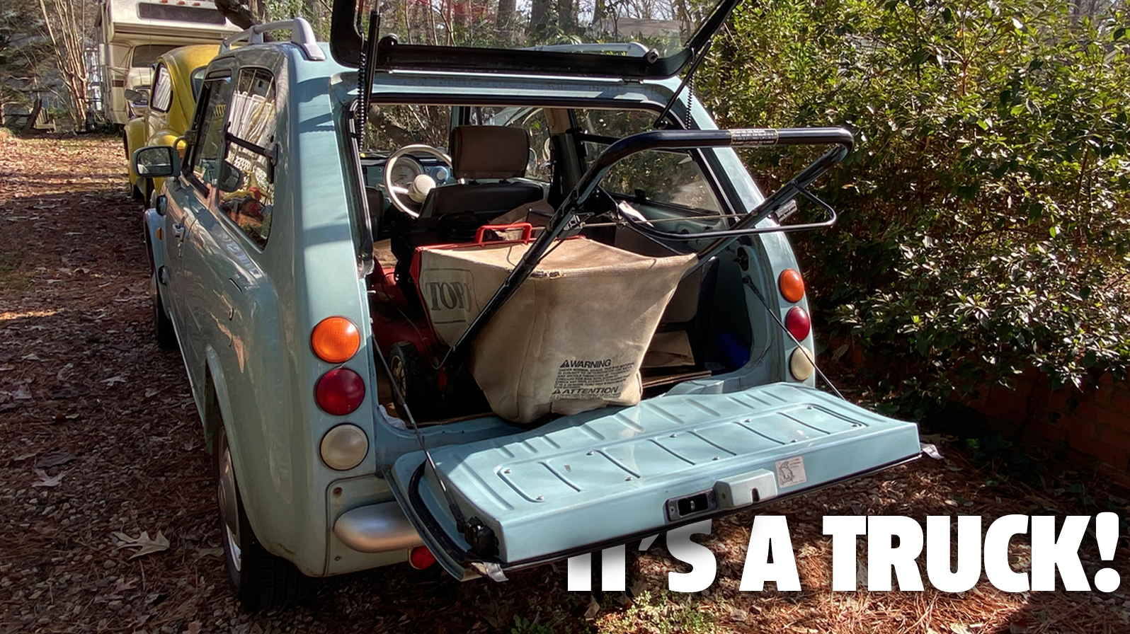 When people rationalize themselves away from buying the interesting cars they actually want and play it "safe" by buying a modern, soul-less SUV, often one of the commonly-cited reasons why is that they sometimes may want to haul big, ungainly things, and that's why they need a big, ungainly car. I say this is bullshit, and I'm here to prove it, with my tiny Nissan Pao and a lawnmower.