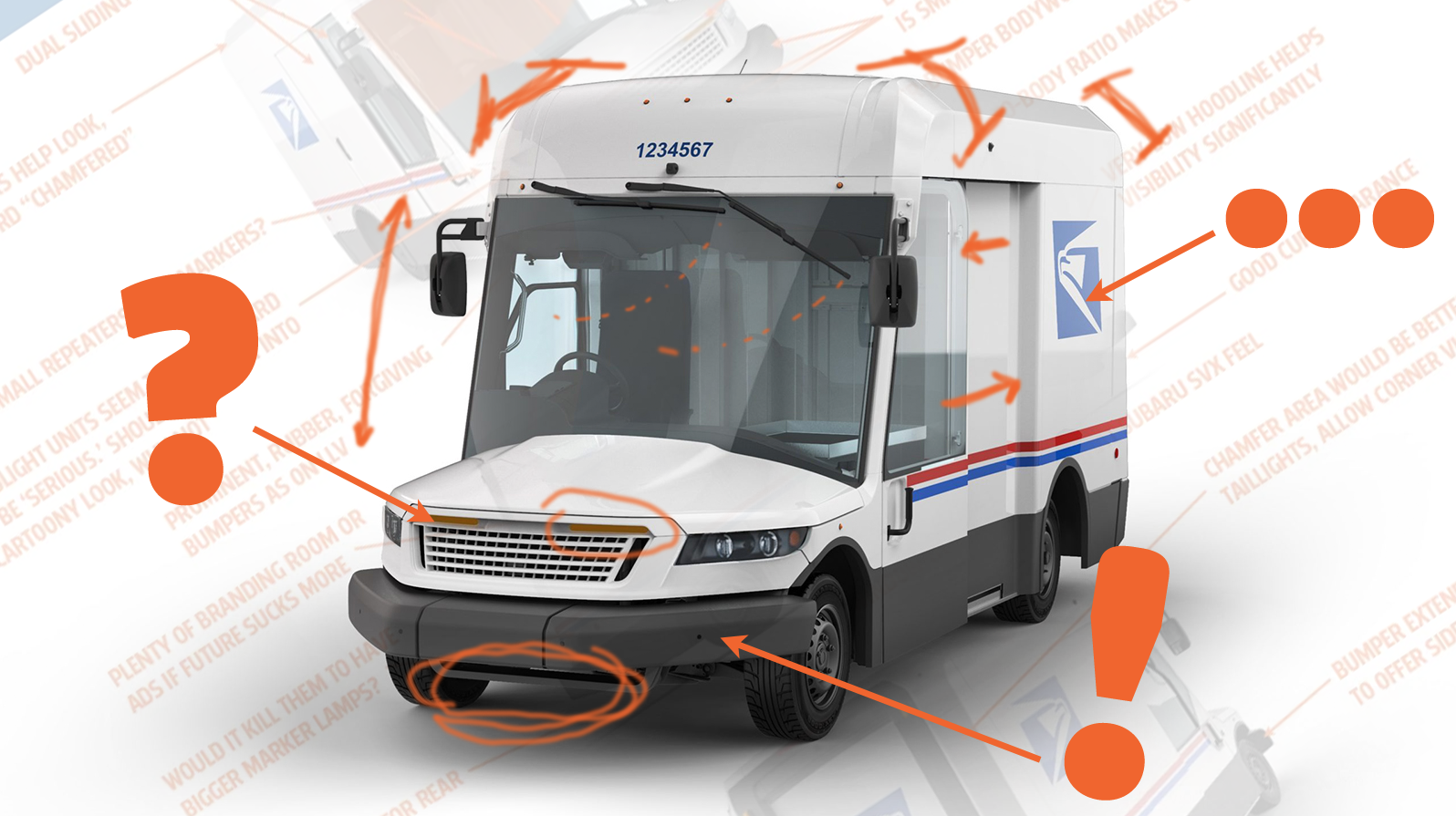 The Oshkosh Next Generation Delivery Vehicle (NGDV) selected is an overall good design, I think; sure, it looks kind of cartoonish in its proportions, but if you think about the design decisions that led to that, it's understandable.
