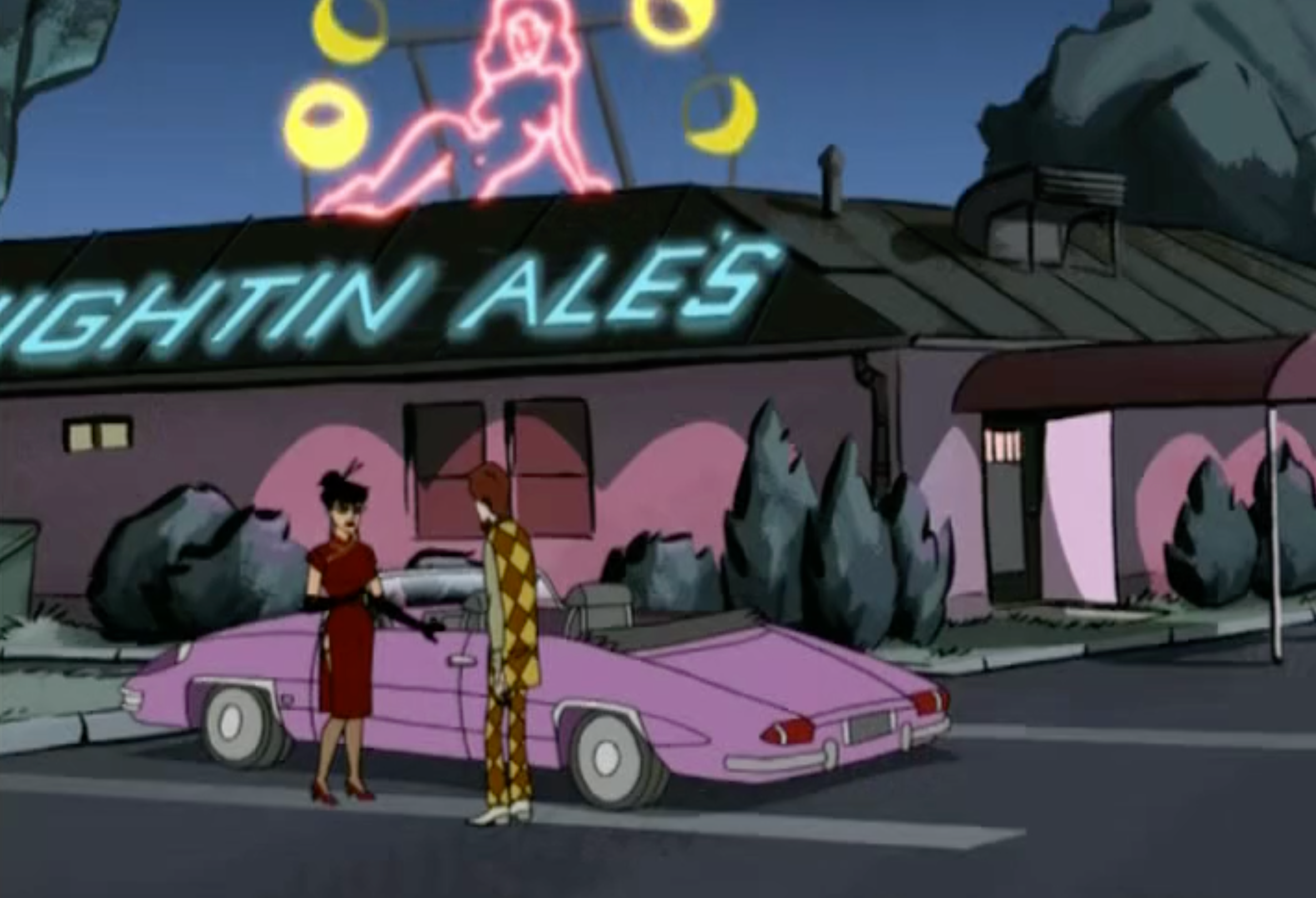 Dr. Girlfriend is The Monarch's No. 2, both in arching and in life. The season one episode Mid-Life Chrysalis is another episode that has a ton of good cars in it. The always lovely, husky-voiced Dr. Girlfriend is usually wearing a Jackie O-inspired pink pillbox hat and white gloves. So it makes sense she'd go with a classic pink '60s sports car to keep up her vintage charm.