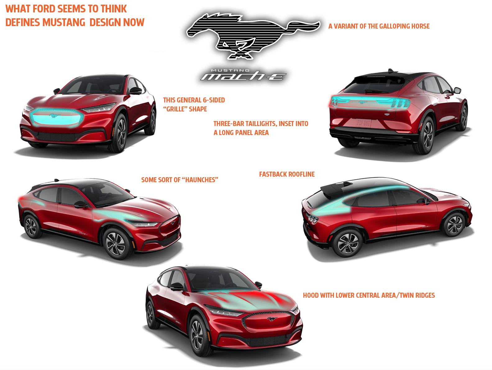 By looking at the design of the Mach-E, I think we can determine what Ford appears to believe are the crucial elements of design that define a vehicle as a Mustang: