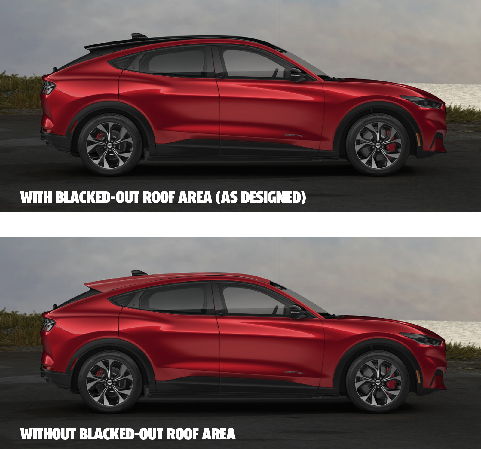 That's a visual cheat to let the Mach-E get more rear headroom while maintaining the dramatically-raked fastback roofline they wanted. You can see this most clearly in profile, and I've taken the liberty of recoloring the roof section with the body color in the lower image so you can see how much of the roofline it's actually hiding: