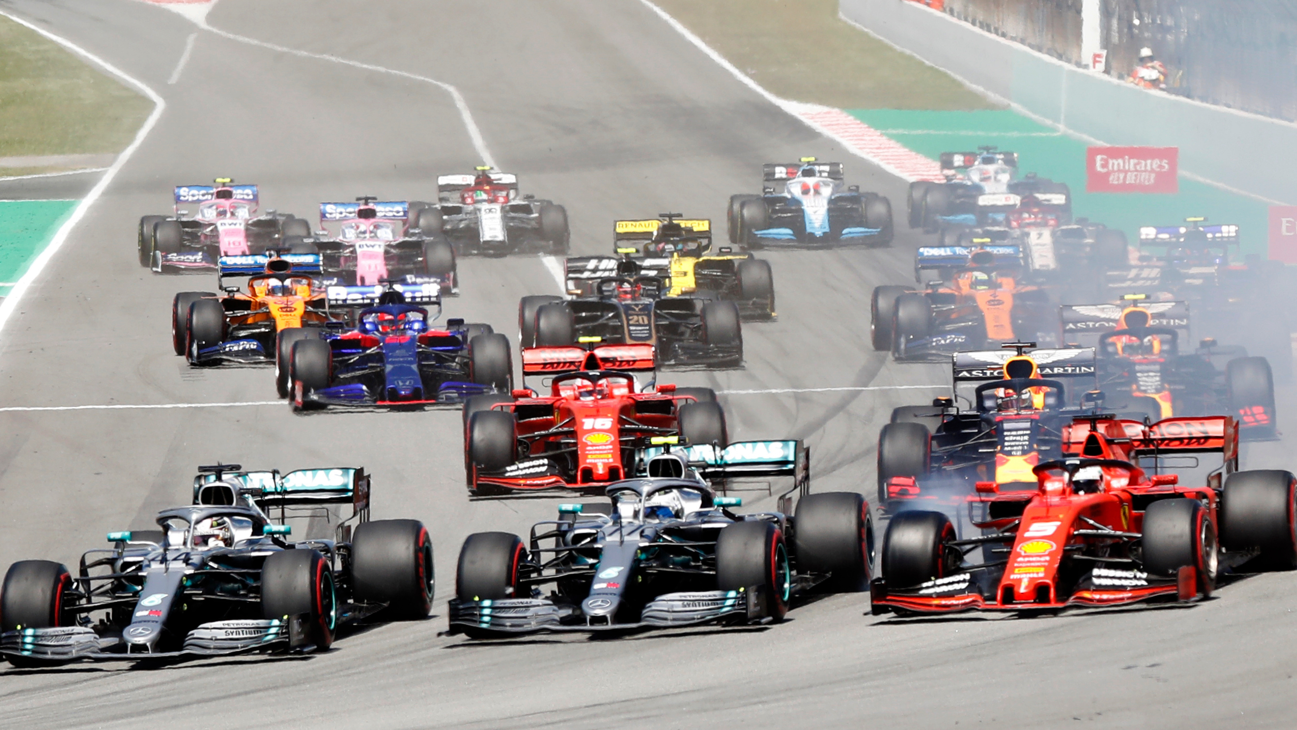 The battle went three wide at turn one, as Ferrari's Sebastian Vettel made an attempt around the outside as well, but was awarded nothing but a flat spotted tire for his efforts. By locking up and going wide, Vettel held up his teammate Charles Leclerc behind, allowing Red Bull's Max Verstappen to leapfrog both of them.