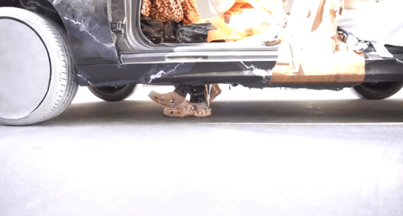 After two days of ripping parts from the car, it's then time to start cutting it to pieces. The saws come out and Spagnola and her team set about making the hole in the floor that's required to get the foot-powered machine up and running. It takes another day of hard work, but soon the car is stripped to its bare bones and there are now two holes in the middle of its floor.