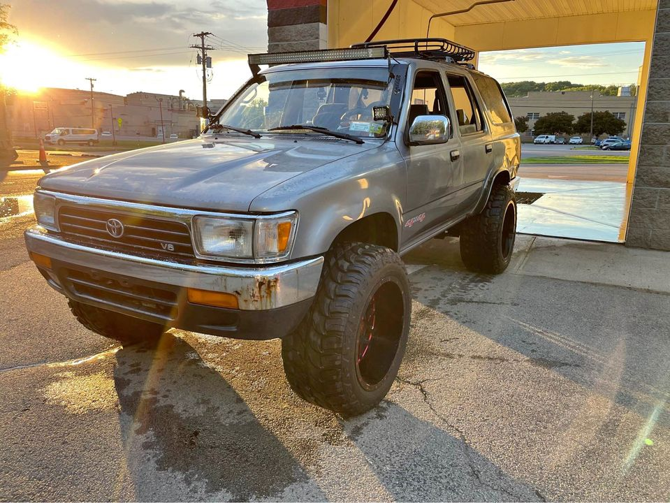 This is an old 4Runner jacked up on tall suspension with LED lights and a roof rack. It should, by all means, be a genuine off-roader — yet, the wheels. Look at these wheels. Get rid of them immediately.