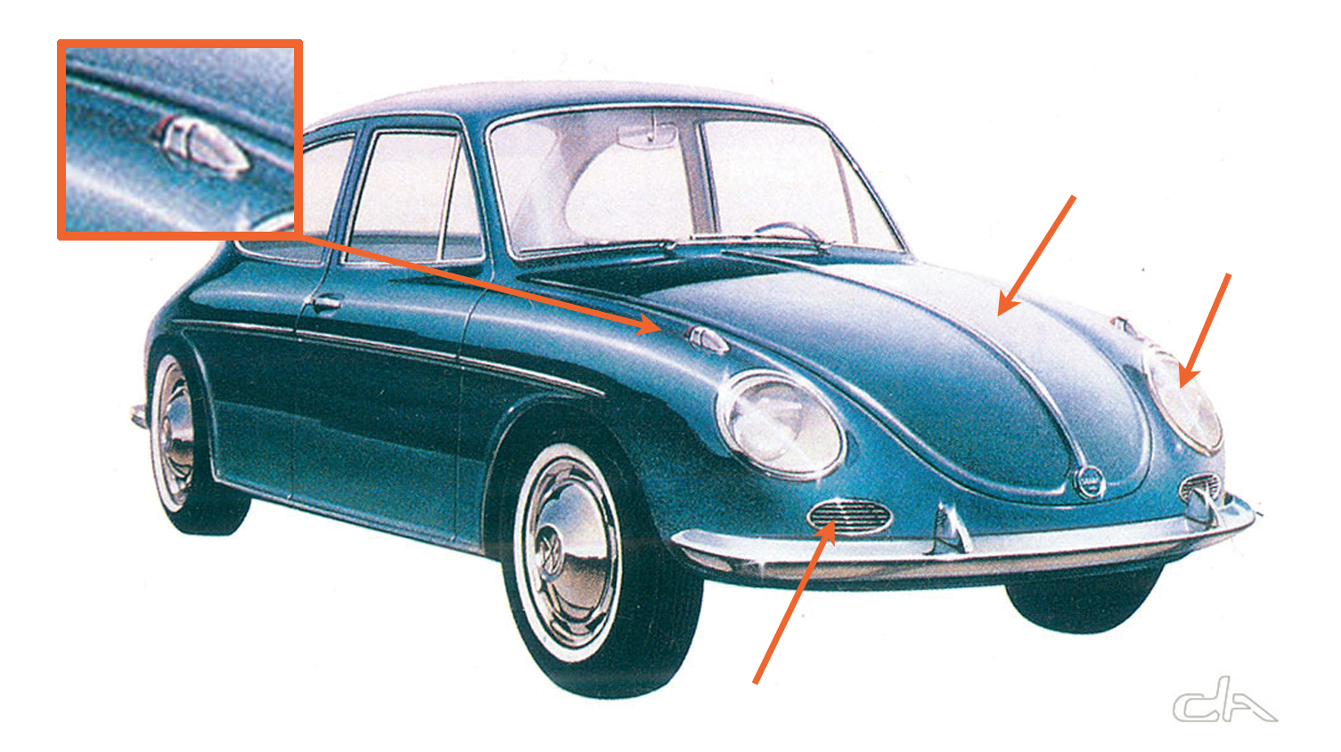 Pre-'68 Beetles had the sloping lights, the lower-mounted chrome bumpers with (in some markets) pretty elaborate guards and overriders, and shapes of fenders and engine lids and hoods that got altered and somewhat simplified in the 1968 facelift, which continued, with the usual lighting and other detail changes, until the Beetle's demise in 2003.