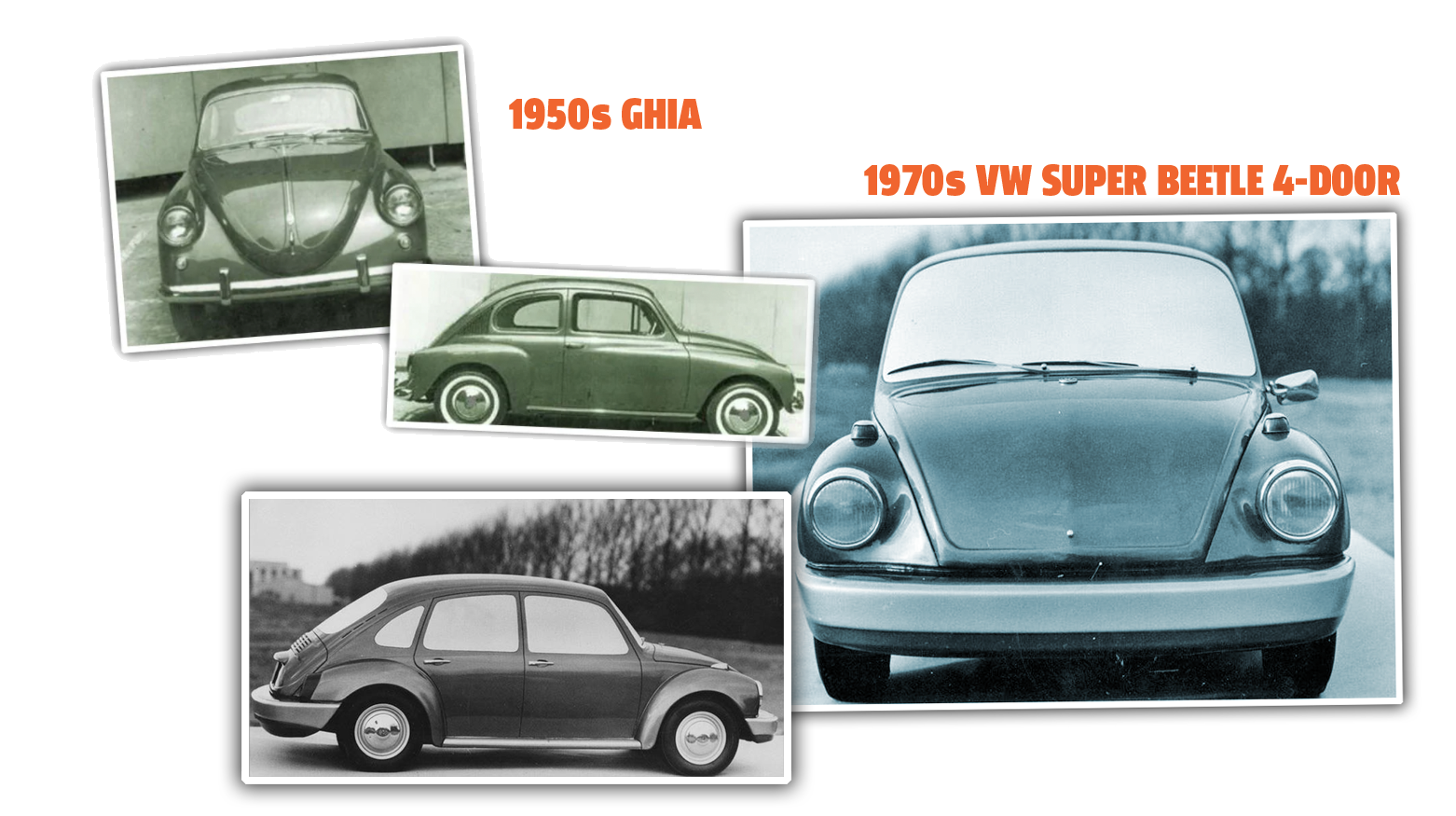 It's also interesting to look at Kellogg's proposal in contrast to a 1950s Ghia Beetle update and an in-house design study for a possible four-door Beetle: