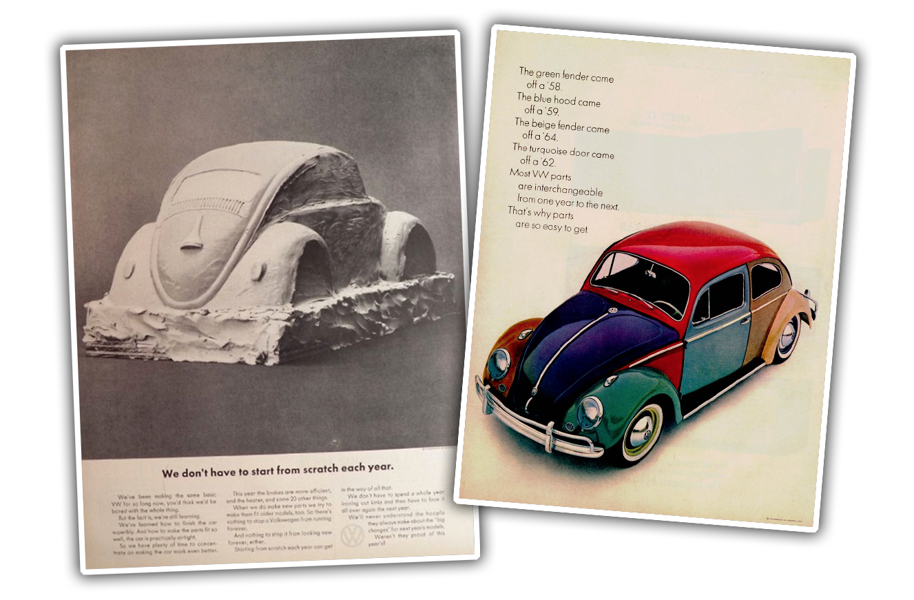 Still, part of the charm of the Beetle was VWs stubborn unwillingness to change its style, which clever ads turned into an asset by suggesting it helped VW focus on more practical changes, and the amazing parts interchangability, where you could bolt on parts to the same car that were decades removed: