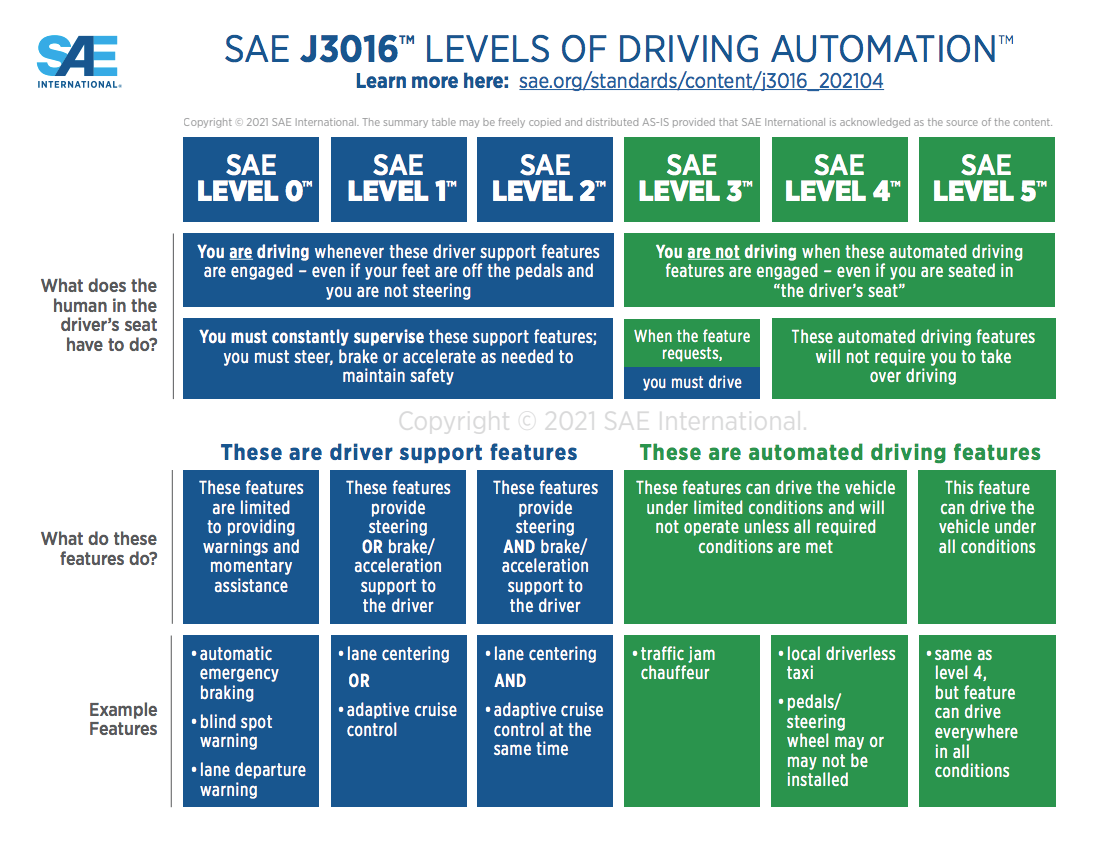 This is something I've been noticing for a while, and it's becoming common enough that I think a whole post is in order to clear some things up. I'm talking about the way autonomous vehicles are classified, as defined by the Society of Automotive Engineers (SAE) in their SAE J3016 Levels of Driving Automation standard. This standard defines a series of six "levels" of automated driving, in hopes of making classification of the capabilities of these vehicles easier. It's a good idea. Too bad it's completely misunderstood by so many people.