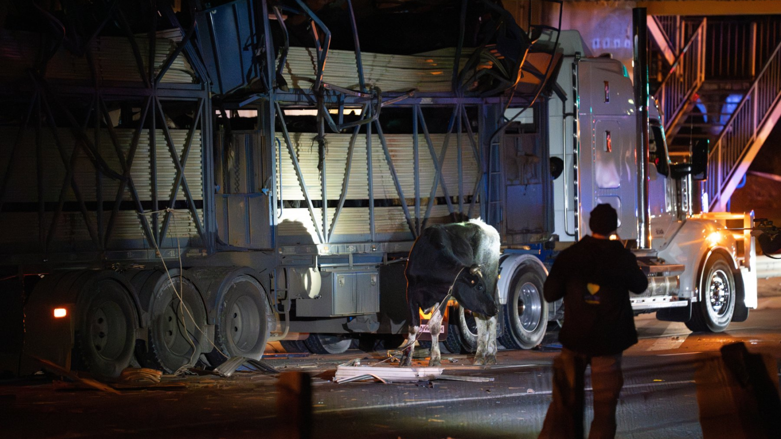 The top deck of the trailer was crushed by the impact, with many of the cattle injured and at least one animal was seen jumping from the trailer. There were also reports of at least two cattle wandering through streets immediately after the collision.