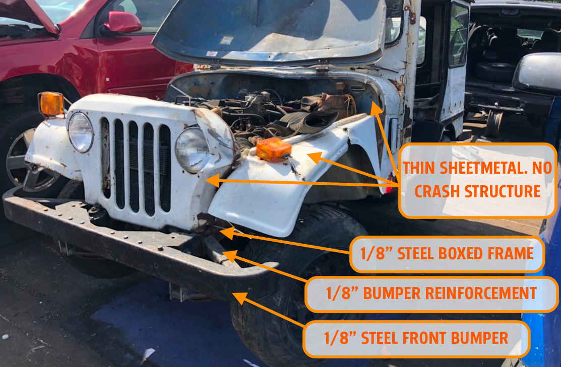 The postal Jeep is a deathtrap. Sure, there's a steel bumper whose outer ends are tied into the frame via reinforcement brackets. But the body itself? There's absolutely no crash structure there. It's all just flimsy sheetmetal.