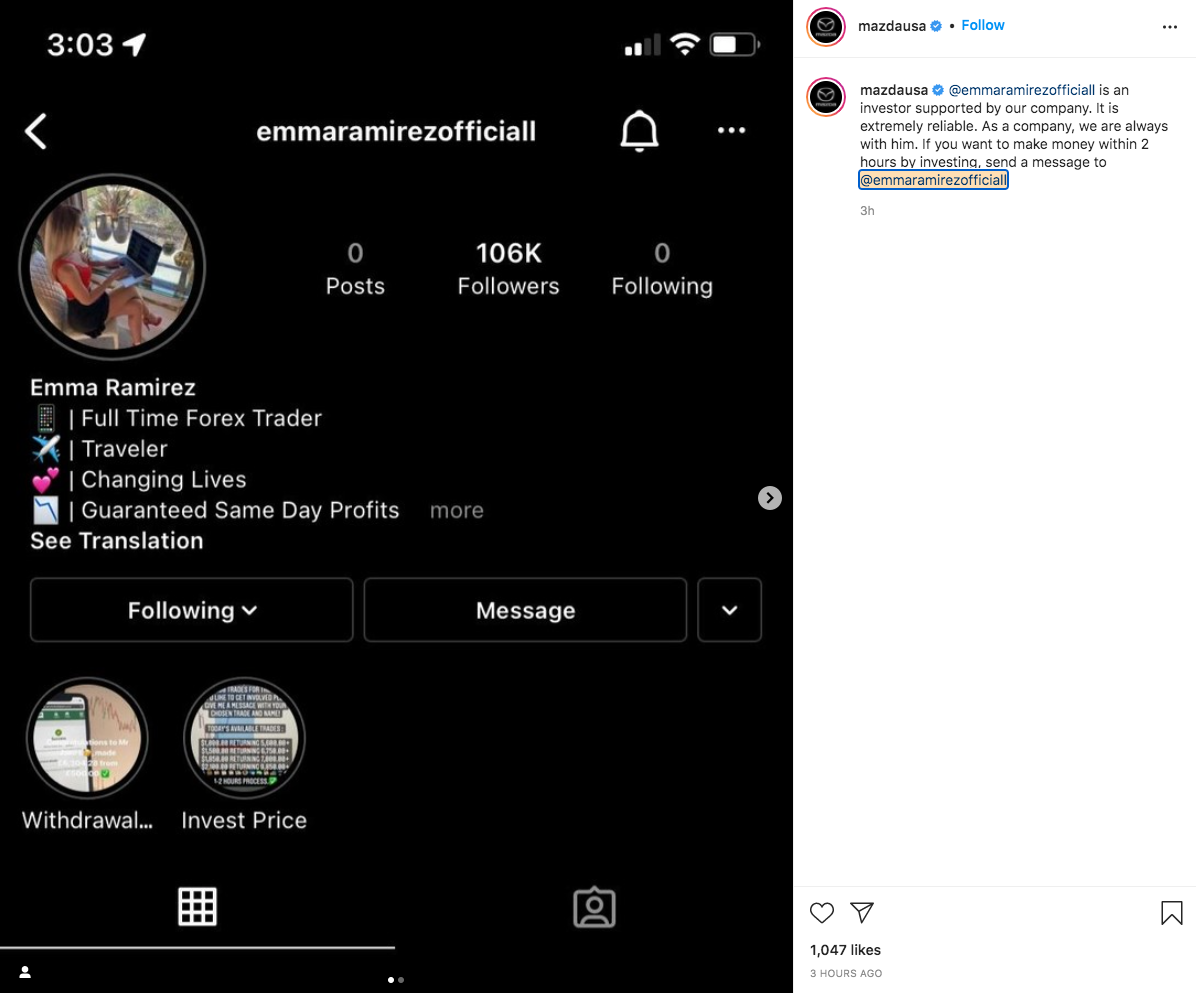 I suspect that Mazda's social media team isn't feeling all that thankful this Thanksgiving, because it either appears that Mazda's Instagram account has been hacked, or that the company has expanded into the lucrative business of, um, some kind of online stock trading scam? Personally, I'd rather they stick to building Miatas, but whatever, I'm no business genius like whoever this @emmaramirezofficiall is that seems to be handling Mazda's finances now.