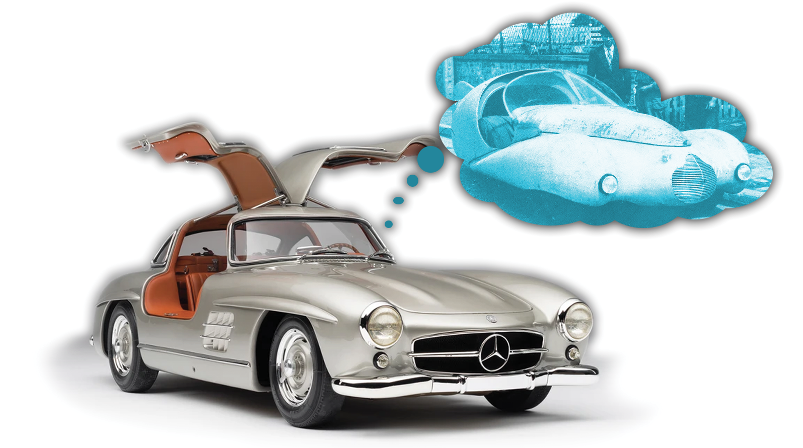 Now, is it possible the Mercedes designers were aware of either the Bouffort or the Bugatti when they were coming up with the gullwing design for their racing car? Maybe. Familiarity with the Bugatti seems a bit more plausible, even though it didn't yet exist, but Bugatti would have absolutely been known to them, and talk of these designs may have been going around the postwar auto-design world.